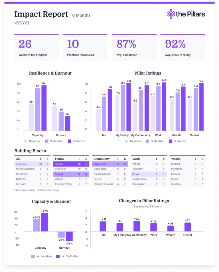At months three and six, every participant receives a full Impact Report. It tracks progress across every dimension of the program from the day they started, so the change isn’t just felt, it’s visible and measurable.